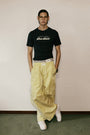 Made from Taslan nylon material, it has a relaxed fit that can be worn lightly. Built-in shorts-length underpants. Front waist banding line and Bad chain stitch logo