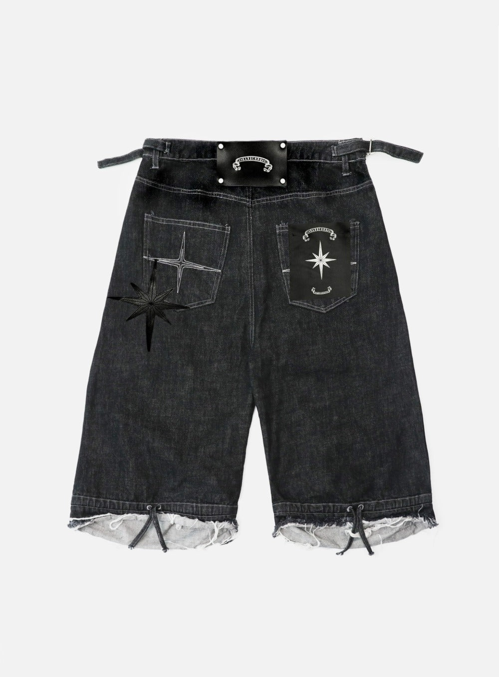 DETAIL Made of high-quality 15oz denim, Cosmo Patch Convex Bermuda Pants with a solid silhouette and various details. Front slit stitch detail. Hem raw edge detail. Side adjust with waist buckle. Hem fit adjustable hem strap. Back back pocket star embroidery. Badblood star label. Back Cosmo leather patch. Badblood square leather patch on waist. * Curved wide fit * Star rivet detail * Back back pocket star embroidery. Badblood star label * Back Cosmo leather patch. Badblood square leather patch on waist. * Medium thickness / No see-through / No elasticity / No lining