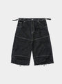 DETAIL Made of high-quality 15oz denim, Cosmo Patch Convex Bermuda Pants with a solid silhouette and various details. Front slit stitch detail. Hem raw edge detail. Side adjust with waist buckle. Hem fit adjustable hem strap. Back back pocket star embroidery. Badblood star label. Back Cosmo leather patch. Badblood square leather patch on waist. * Curved wide fit * Star rivet detail * Back back pocket star embroidery. Badblood star label * Back Cosmo leather patch. Badblood square leather patch on waist. * Medium thickness / No see-through / No elasticity / No lining