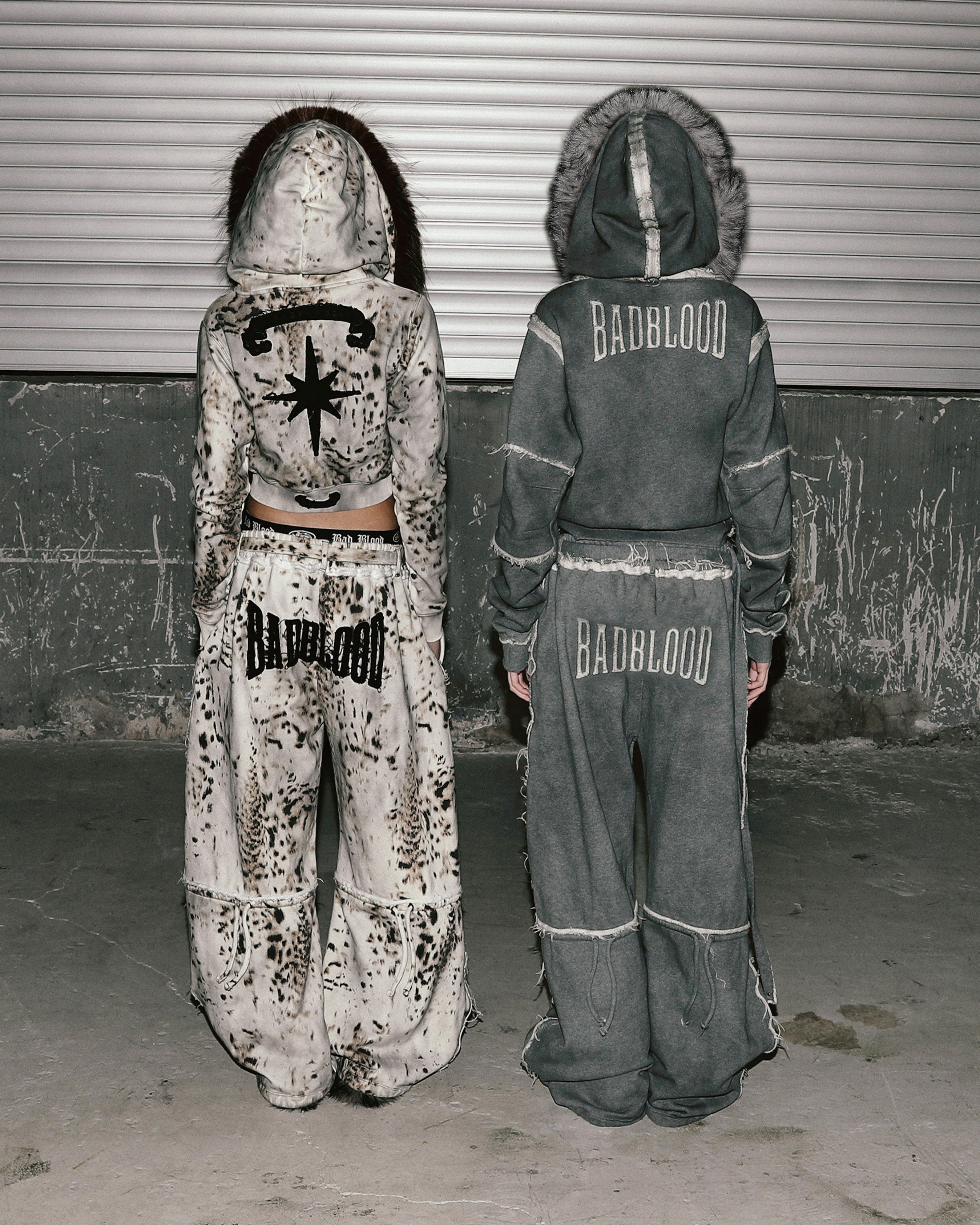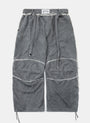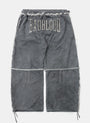 前後飾有 Bad 標誌,縫線處呈現仿舊風格,褲腳附有可調整束帶設計。