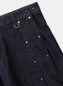 側邊設有鉚釘調節扣,可調整腰圍,褶線處亦有鉚釘裝飾細節。