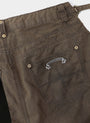 兩側鉚釘裝飾的隱藏口袋和後方貼布口袋,膝部縫線細節。