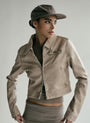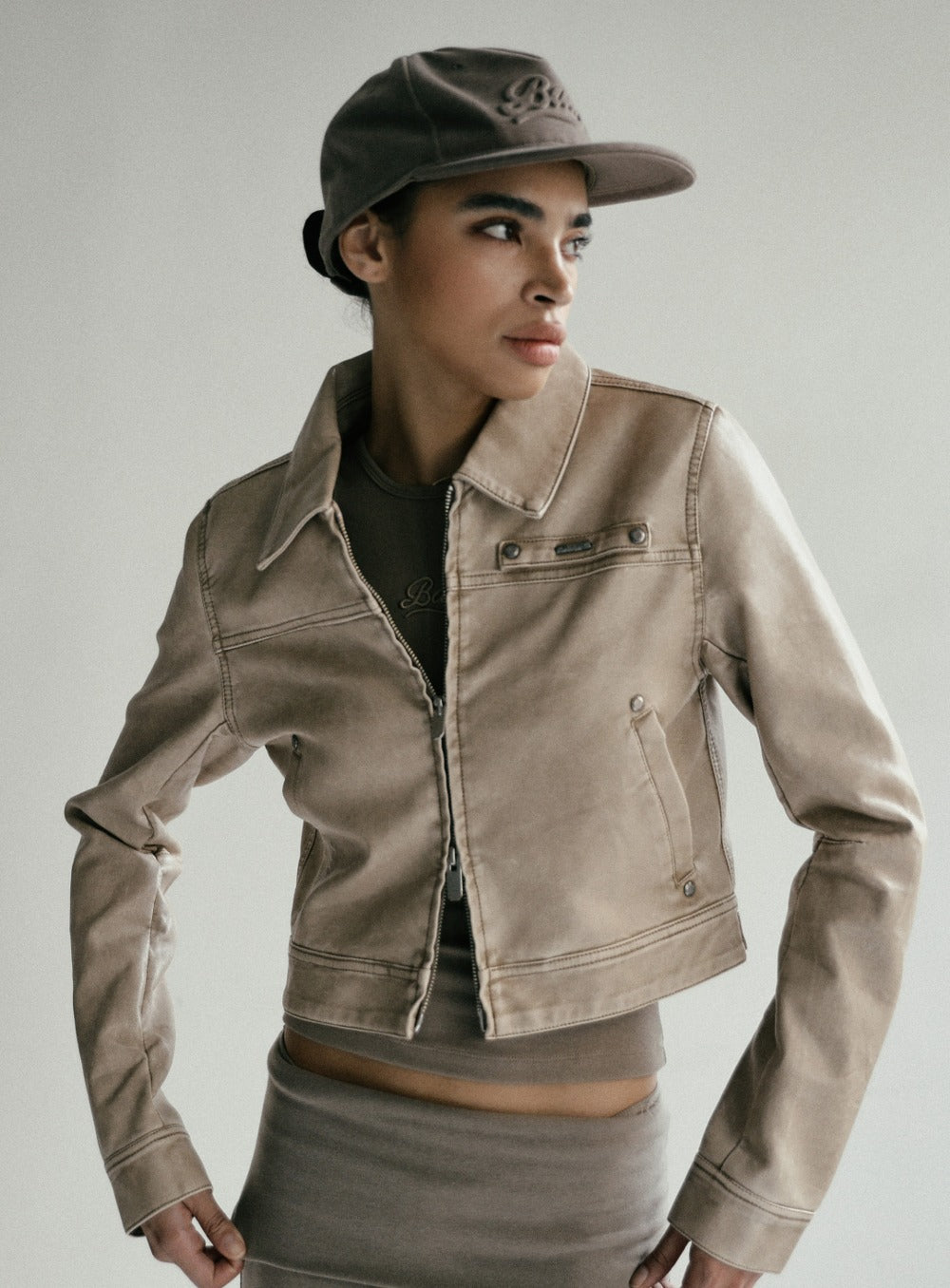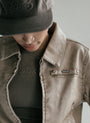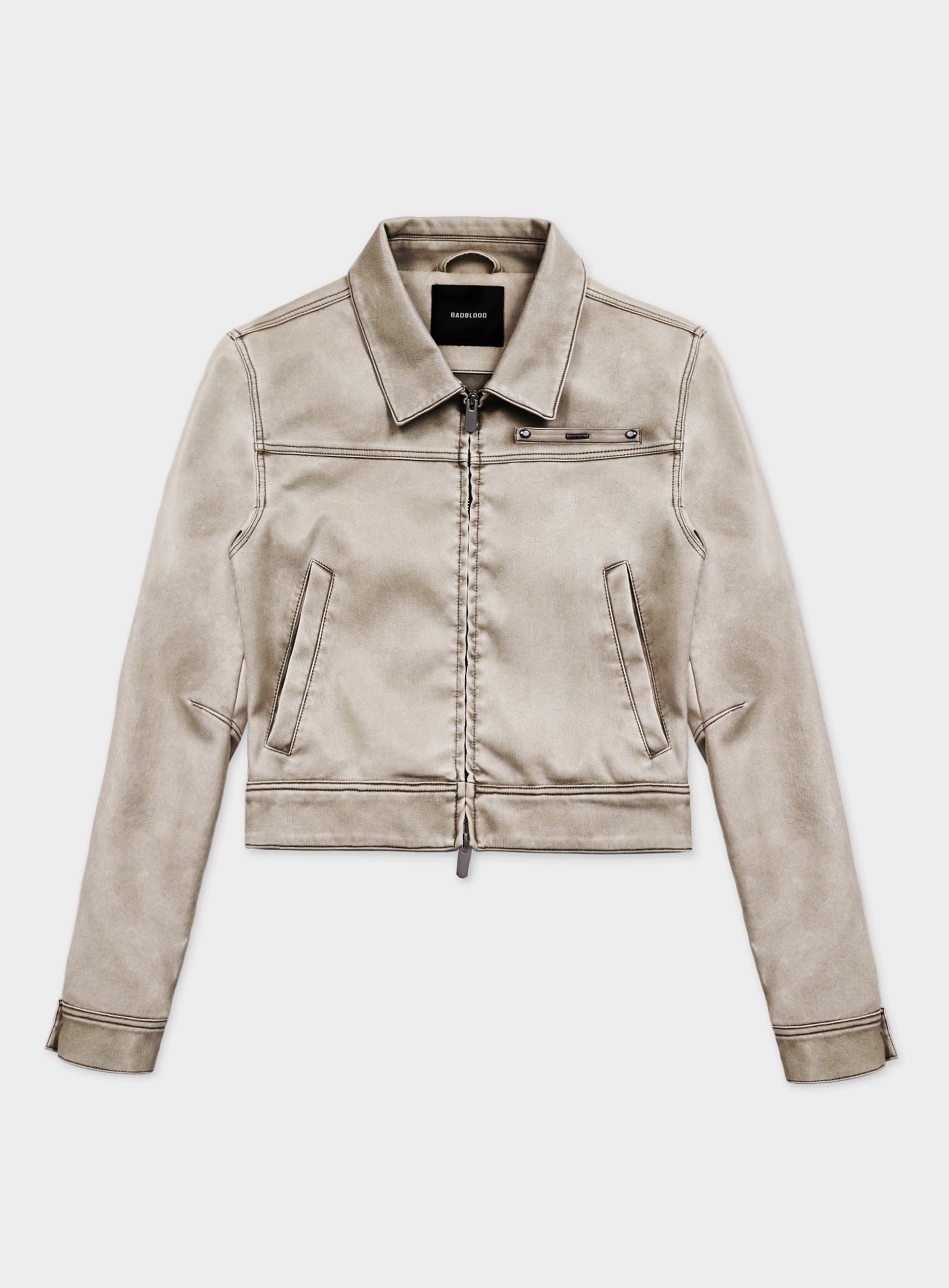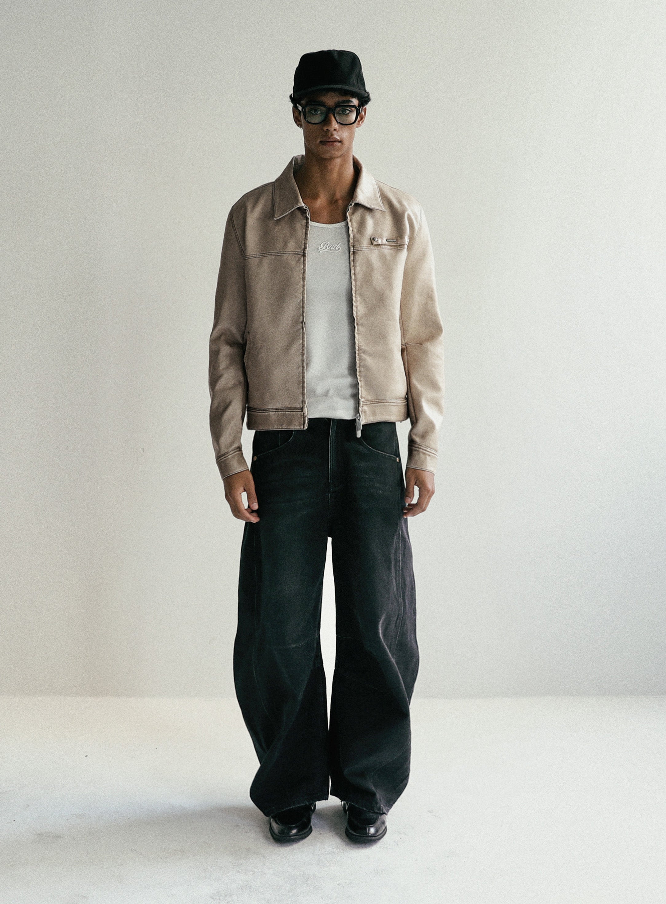 A washed leather Harrington jacket with a vintage vibe that stands out for its natural washing.