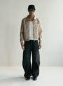 Front Badblood metal logo fabric handle detail. Front and back yoke lines and pocket rivet finishing details.