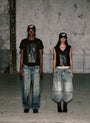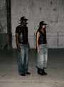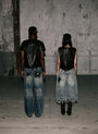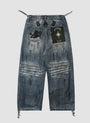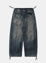DETAIL 0209 Hard Washed Baggy Jeans made of cotton denim material that has been bleached and sand washed, featuring a subtle wash and a strong logo detail with a street mood. Adjustable waist with side adjusters. Distressed details on waist and hem. Adjustable hem fit with a fabric strap. Back signature BAD leather patch. Back pocket lion leather patch. * Wide baggy fit * Washed effect * Back signature BAD leather patch. Back pocket lion leather patch * Normal thickness / No see-through / No elasticity / No lining