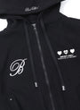 DETAIL Classic logo hooded zip-up made from soft cotton-blend terry material. Hood strings with adjustable fit. Riveted front pockets. Ribbed finish. Front 2 way zip fastening. Front classic B embroidery logo and Bad heart embroidery logo. Badblood script embroidered logo on center and back of hood. * Unisex (S size - cropped fit, M, L size - regular fit) * Front riveted pockets, ribbed finish, front 2-way zipper closure * Front classic B logo, Bad heart embroidery logo * Badblood script logo on hood center and back * Thickness / No transparency / Slight elasticity / No lining FABRIC Cotton 80% / Polyester 20% SIZE (total length / shoulder width / sleeve length / chest cross section / hem) S | 53cm/50cm/66cm/60cm/38cm M | 60cm/53cm/67cm/65cm/44cm L | 64cm/58cm/68cm/68cm/47cm