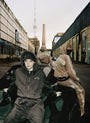 Side color blocking 4-line detail. Hem tab button, and fabric strap for a variety of fits.