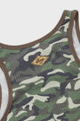 Ribbed binding on the armholes and neckline with a military pattern color scheme.