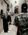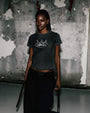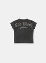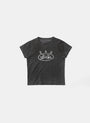 A crack print T-shirt with a vintage wash that stands out in a street mood using a dirty aging process.